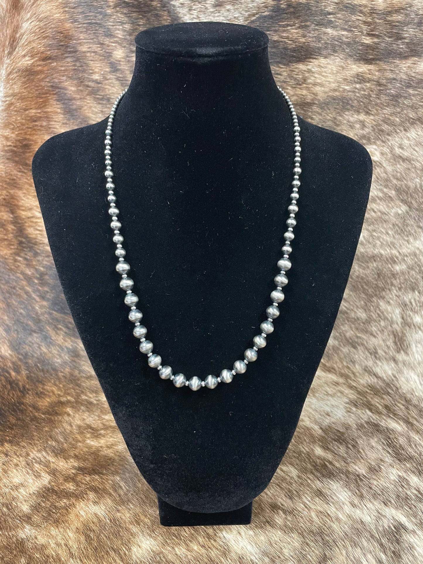 Authentic silver Navajo pearls on flexible steel wire with stainless steel bead tips that encase the end of the wires to prevent wire breakage and scratches to skin. The extender chain is 1.5 inches in length allowing for a total length of 20 inches to 21.5 inches.