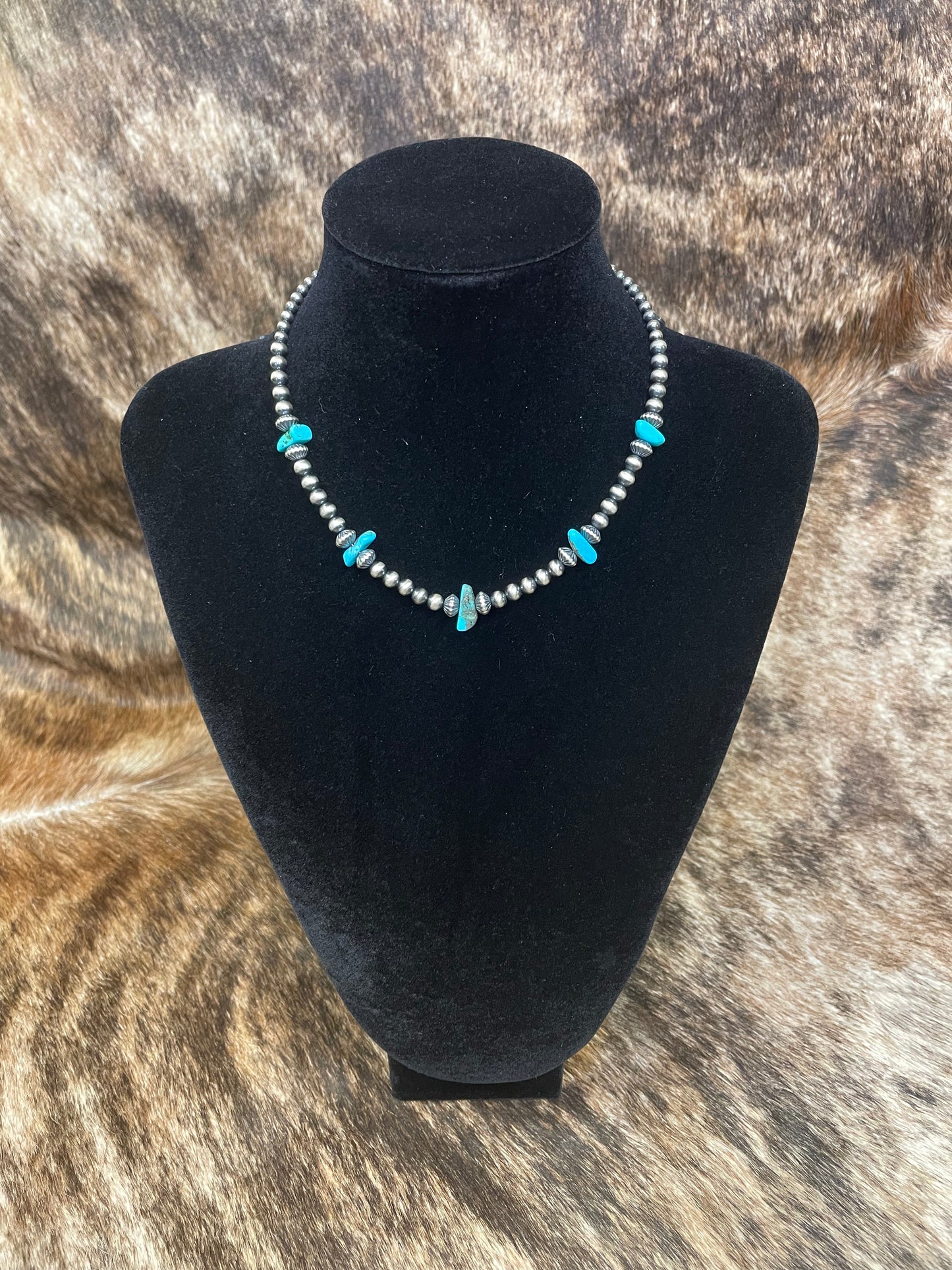 Authentic silver Navajo pearls and turquoise strung on flexible steel wire with stainless steel bead tips that encase the end of the wires to prevent wire breakage and scratches to skin. The extender chain is 1.5 inches in length allowing for a total length of 14.5 inches to 16 inches.